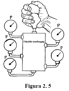Ao considerarmos um fluido confinado e a este aplicarmos uma pressão, esta será transmitida integralmente a todos os seus pontos. (Figura 2.5)