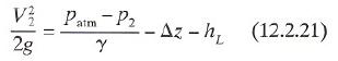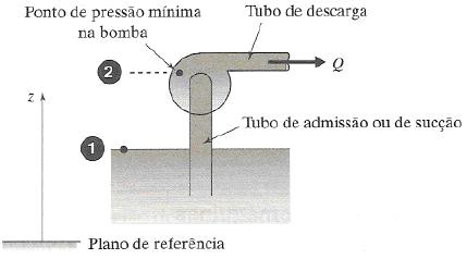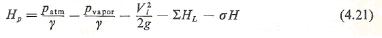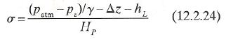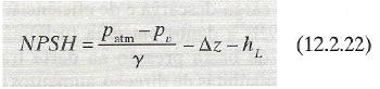 em que hL é a perda entre o ponto 1 e o ponto 2, Dz = Z2 – Z1 e a energia cinética no ponto 1 é suposta desprezível. A pressão mínima permissível no ponto 2 é a pressão de vapor pv. Substituindo isso na expressão, pode-se dizer que o lado esquerdo da Eq. 12.2.21 representa a máxima carga de energia cinética possível no ponto 2 quando a cavitação for iminente. Portanto a altura de sucção positiva líquida (NPSH) é definida como: