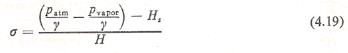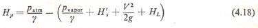 onde H é a altura dinâmica total desenvolvida pela bomba, e o numerador é o NPSH. O termo H. é semelhante ao expresso pela Eq. (4.17), porém a velocidade, no caso, é a existente na boca de entrada da bomba. O aumento de velocidade da boca de entrada da bomba até o bordo das pás já é levado em conta no valor do parâmetro (s). O valor de (s) para cada tipo de bomba é geralmente fornecido pelo fabricante da bomba e é obtido em ensaio experimental. Substituindo a relação expressa pela Eq. (4.17) na Eq. (4.19), podemos escrever:
