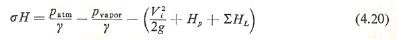 em que s é o número de cavitação de Thoma. Esse parâmetro é usado como alternativa para a NPSH a fim de estabelecer os critérios de projeto para cavitação. Um número de cavitação crítico, que sinaliza que a cavitação é iminente, é determinado experimentalmente. Portanto, para que não ocorra cavitação, (s) deve ser maior que o número de cavitação crítico. O número de cavitação está em forma adimensional, que é preferível à forma dimensional da NPSH”.