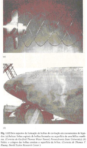 “Como se sabe, a pressão sobre um líquido só pode ser reduzida até o limite de sua pressão de vapor, numa dada temperatura, abaixo da qual ocorre espontaneamente a vaporização (ou ebulição) do líquido. Esta vaporização em geral produz cavidades e por isso ocorre o fenômeno chamado de cavitação. A formação, o arraste pelo fluido e o subseqüente colapso rápido destas cavidades são fatores que produzem vibração, corrosão destrutiva e outros efeitos deletérios sobre as máquinas hidráulicas, amortecedores hidráulicos e hélices propulsoras de navios, para citar alguns exemplos”.