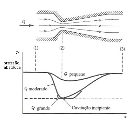 “É fato aceito tradicionalmente que, se a pressão absoluta em qualquer ponto de um sistema de bombeamento atingir valor igual ou inferior à pressão de vapor do líquido, na temperatura de bombeamento, parte deste líquido se vaporizará. Vamos supor que as bolhas formadas continuem em trânsito com o líquido bombeado. Nestas condições, quando esta mistura atingir alguma região onde a pressão absoluta for novamente superior à pressão de vapor do líquido na temperatura de bombeamento, haverá o colapso das bolhas com retorno à fase líquida. Entretanto, como o volume específico do líquido é inferior ao volume especifico do vapor, o colapso das bolhas implicará a existência de um vazio, proporcionando o aparecimento de onda de choque,... a penetração de líquido na depressão originada pela deformação da bolha produz um microjato na ocasião do colapso. Desta forma, o efeito é mais severo quando o colapso ocorre em local junto ou próximo à superfície metálica. Neste caso, o microjato incide diretamente sobre a superfície enquanto que, no caso de bolhas que colapsam na corrente líquida, o impacto é transmitido através de ondas de choque. Esta seqüência de acontecimentos pode ser facilmente visualizada pelo escoamento de um líquido através de um tubo venturi, conforme ilustrado na Fig. 10.2. Neste caso, a velocidade máxima e, conseqüentemente a pressão mínima, ocorrem na garganta do tubo. Então se formos aumentando a vazão, chegaremos a uma situação em que a pressão de vapor é atingida na garganta, propiciando o início da cavitação. É interessante notar que o colapso das bolhas ocorre em região logo após a garganta do tubo venturi.