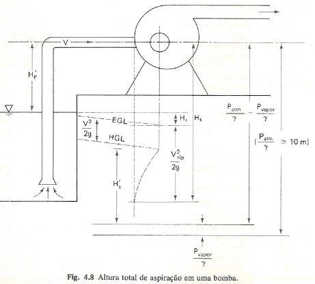 A velocidade máxima próxima ao bordo de entrada das pás não é em geral mensurável pelos usuários das bombas. Os fabricantes de bombas se referem em geral a uma grandeza conhecida na prática como altura positiva líquida de sucção, tradução que alguns autores deram ao net positive suction head (NPSH), ou H’S, como indica a Fig. 4.8. Conhecendo-se o valor de NPSH requerido pela bomba, a altura da bomba acima do reservatório (altura estática de aspiração) pode ser facilmente determinada: